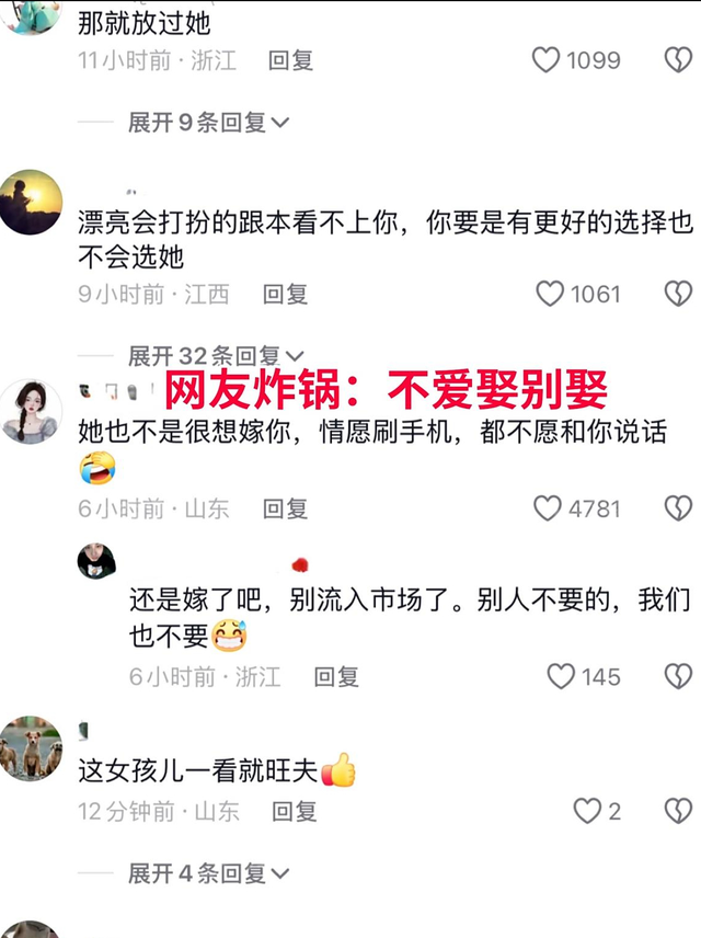 还有人嘲讽道:“我看她也不是很想嫁给你,情愿刷手机,都不和你说话。再说了,你俩半斤对八两,谁也别嫌弃谁。都36了,还搞颜值歧视,难怪没对象!”