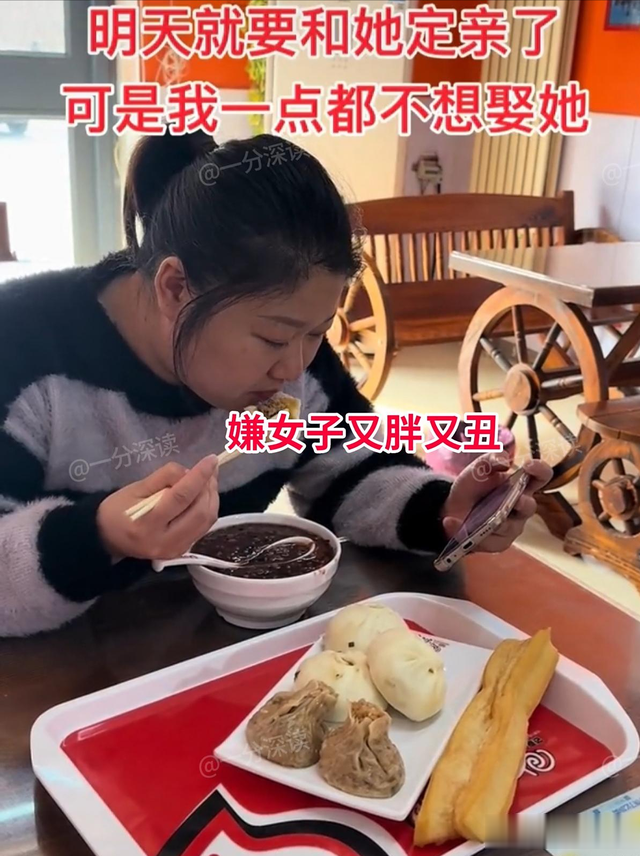 “老姨介绍的相亲女孩,明天就要定亲了。今天带她吃早餐,吃得太多了,还这么胖。长得也不好看,还不会打扮,根本就配不上我,这样的女孩谁喜欢!”